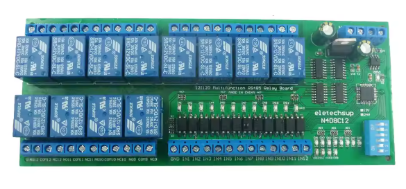12-kanałowy moduł przekaźnikowy to wszechstronna karta rozszerzeń wejść/wyjść, przeznaczona do integracji z systemami PLC, mikrokontrolerami oraz instalacjami automatyki budynkowej i przemysłowej. Prezentowany wariant układu jest dedykowany do zasilania napięciem stałym 12 V i dostarczany w postaci samej płyty głównej, bez obudowy przystosowanej do montażu na szynie DIN. Z urządzeniami nadrzędnymi sprzęt komunikuje się poprzez dwuprzewodową magistralę RS485, operując na standardowym protokole Modbus RTU. Konstrukcja umożliwia równoległe wpięcie do 64 takich modułów w jedną sieć komunikacyjną. Płytka posiada 12 portów wejściowych zabezpieczonych izolacją fotoelektryczną, reagujących na stan niski (NPN), oraz 12 przekaźników wykonawczych zdolnych do sterowania obciążeniami do 10 A przy 250 V AC lub 30 V DC. Urządzenie wspiera szeroki wachlarz funkcji logicznych, takich jak tryb monostabilny, bistabilny, opóźnienia czasowe do 255 sekund oraz sprzętowe blokady wzajemne pomiędzy kanałami.