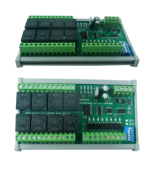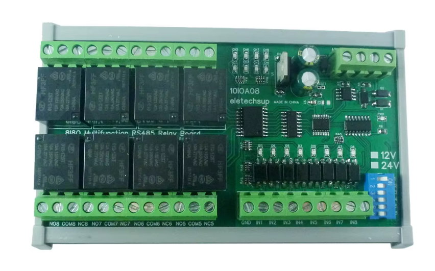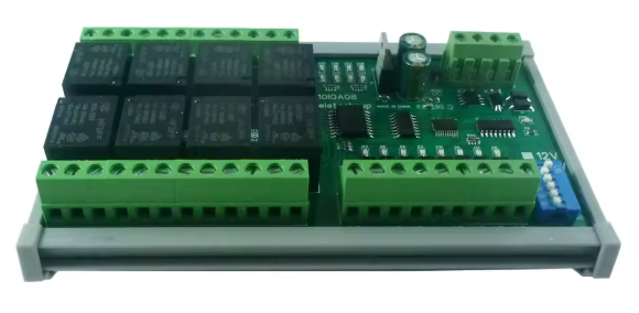 8-kanałowy moduł przekaźnikowy to karta rozszerzeń wejść i wyjść cyfrowych, zaprojektowana do integracji z systemami sterowania PLC oraz cyfrowymi instalacjami automatyki. Prezentowana wersja zasilana jest napięciem 24 V DC i dostarczana w dedykowanej, trudnopalnej (klasa V0) szarej obudowie, przystosowanej do montażu na standardowej szynie DIN35 oraz C45. Z urządzeniami nadrzędnymi układ komunikuje się za pośrednictwem magistrali szeregowej RS485 (UART), wykorzystując standardowy przemysłowy protokół Modbus RTU. Architektura urządzenia pozwala na równoległe zaadresowanie i podłączenie do 64 modułów na jednej wspólnej linii komunikacyjnej. Część wykonawcza dysponuje 8 wejściami cyfrowymi z pełną izolacją fotoelektryczną (wyzwalanie stanem niskim NPN) oraz 8 wzmocnionymi przekaźnikami elektromagnetycznymi, przystosowanymi do przełączania obciążeń o maksymalnej wartości 10 A przy 250 V AC lub 30 V DC.