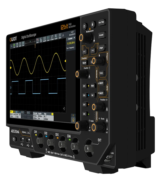 Oscyloskop cyfrowy OWON ADS3202A to zaawansowane urządzenie pomiarowe z serii ADS3000A, które integruje w sobie funkcje oscyloskopu, 2-kanałowego generatora arbitralnego 50MHz, multimetru, licznika częstotliwości, analizatora widma FFT oraz analizatora protokołów. Model ten wyróżnia się wysoką rozdzielczością pionową wynoszącą 12-bit, co pozwala na znacznie dokładniejsze odwzorowanie sygnałów w porównaniu do standardowych oscyloskopów 8-bitowych. Urządzenie pracuje pod kontrolą systemu Android, co w połączeniu z dużym, 10.1-calowym ekranem dotykowym, zapewnia intuicyjną obsługę gestami oraz łatwe zarządzanie plikami i pomiarami.