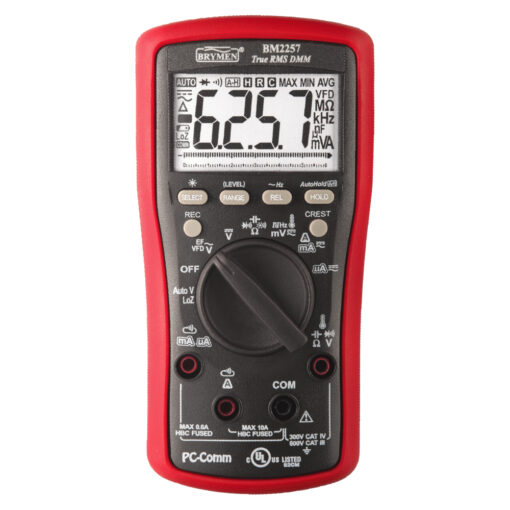 Multimetr cyfrowy BRYMEN BM2257 to zaawansowane, kompaktowe urządzenie pomiarowe z rzeczywistą wartością skuteczną True RMS, stworzone z myślą o elektrykach, automatykach oraz pracownikach utrzymania ruchu i przemysłu. Doskonale sprawdza się w codziennych, wymagających zadaniach dzięki wysokiemu stopniowi ochrony przed przepięciami na poziomie CAT IV 300V oraz CAT III 600V. Miernik oferuje innowacyjną funkcję AutoV™, która automatycznie rozpoznaje i mierzy napięcie stałe lub zmienne w zależności od tego, które jest wyższe. Dodatkowo wbudowana funkcja EF-Detection umożliwia bezpieczną, bezdotykową oraz jednobiegunową detekcję przewodów pod napięciem.