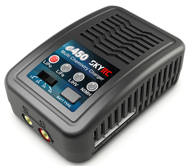 Obsługa E450 jest maksymalnie uproszczona, dzięki dwóm przełącznikom, które pozwalają użytkownikowi na szybki wybór typu akumulatora (LiPo, LiFe, LiHV, NiMH) oraz odpowiedniego prądu ładowania (1A, 2A, 3A lub 4A). Wbudowany balanser z prądem 300 mA automatycznie zapewnia równe naładowanie wszystkich ogniw w pakietach litowych, maksymalizując ich żywotność. Proces ładowania jest monitorowany przez 4 diody LED, które w jasny sposób sygnalizują aktualny postęp ładowania. Ładowarka posiada również podstawowe zabezpieczenia przed zwarciem i odwrotną polaryzacją.