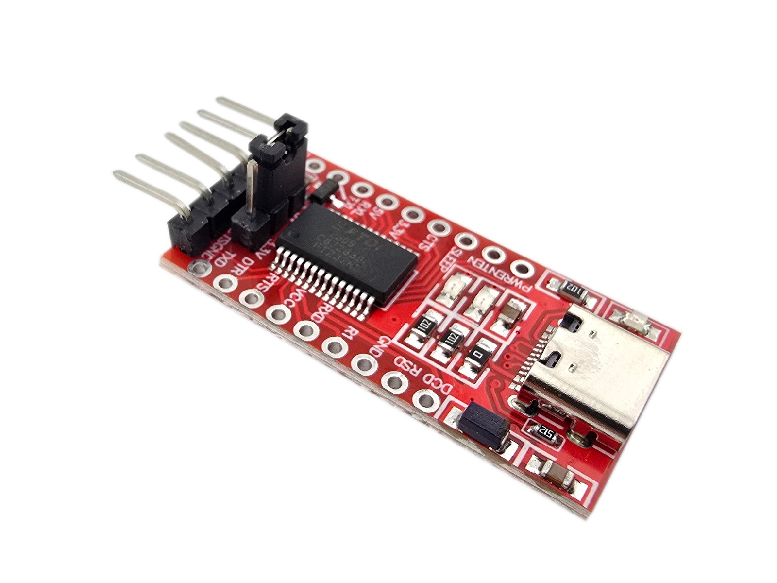 Konwerter USB-UART oparty na niezawodnym układzie FTDI FT232RL ze złączem USB-C zapewnia stabilną komunikację szeregową między komputerem a mikrokontrolerami lub modułami IoT. Po podłączeniu urządzenie jest automatycznie rozpoznawane jako wirtualny port COM, co znacznie ułatwia konfigurację i pozwala na błyskawiczne rozpoczęcie pracy. Wbudowana zworka umożliwia wybór poziomu logiki (3,3 V lub 5 V), a wyprowadzone sygnały sterujące i czytelne diody LED pozwalają na wygodne monitorowanie zasilania oraz transmisji danych.
