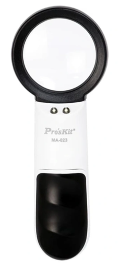 Lupa ręczna Pro'sKit MA-023 narzędzie inspekcyjne wyposażone w innowacyjny system dwóch soczewek. Główna soczewka o średnicy 50 mm oferuje powiększenie 3.5x, idealne do ogólnych prac, takich jak czytanie drobnego druku czy lutowanie. Dodatkowo, w rękojeści ukryta jest wysuwana soczewka o średnicy 18 mm i bardzo dużym powiększeniu 20x, która pozwala na dostrzeżenie mikroskopijnych detali, pęknięć na płytkach PCB czy ocenę jakości biżuterii.
