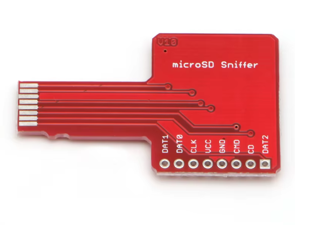 Adapter diagnostyczny przeznaczony do przechwytywania transmisji danych. Jego głównm zastosoywaniem jest podsłuchiwanie oraz debugowanie komunikacji na magistrali SPI pomiędzy kartą pamięci a urządzeniem hostującym np. sprzętem audio/wideo. Najważniejsze parametry tego układu to bezpośrednia kompatybilność z formatem kart TF Micro SD oraz wyprowadzenie kluczowych linii sygnałowych na łatwo dostępne złącze.