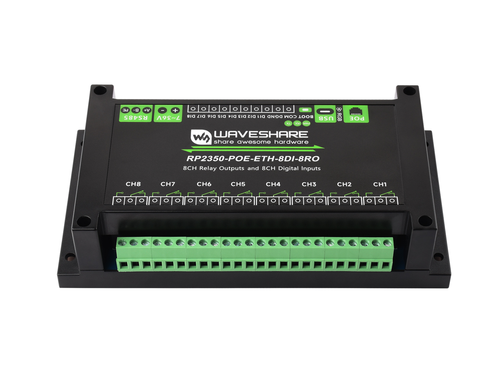 Ten przemysłowy moduł sterujący jest oparty na potężnym, dwurdzeniowym mikrokontrolerze RP2350B (z dwurdzeniową architekturą ARM Cortex-M33 / Hazard3 RISC-V). Zapewnia on 8 kanałów izolowanych wejść cyfrowych (DI) oraz 8 kanałów wyjściowych przekaźników (RO) o dużej obciążalności (max. 10A 250V AC / 30V DC), co czyni go idealnym rozwiązaniem do zaawansowanych aplikacji automatyki przemysłowej i IoT. Moduł wspiera szeroki zakres zasilania 7~36V DC i jest umieszczony w obudowie na szynę DIN, gotowej do montażu w szafach sterowniczych.
