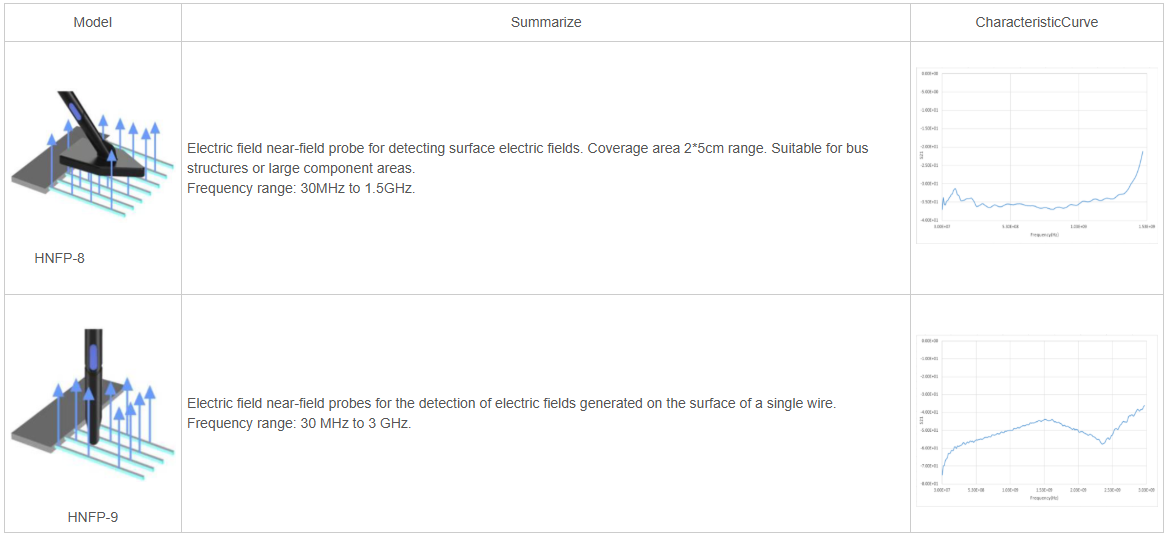 Zestaw sond serii HNFP obejmuje dwie wysokoczęstotliwościowe sondy zaprojektowane do pomiaru pól elektrycznych (E). Są to sondy pola bliskiego, które przede wszystkim służą do lokalizowania źródeł zakłóceń elektrycznych. Sondy działają w zakresie częstotliwości od 30 MHz do 3 GHz i dostępne są w dwóch wariantach kształtu. Podłącza się je bezpośrednio do spektrometru lub oscyloskopu za pomocą kabla 50 Ω. Kiedy zakłócenia przewodzone lub emitowane przez urządzenie przekraczają dopuszczalne normy, sondy pola bliskiego pozwalają zidentyfikować, który element lub obwód generuje zakłócenia o określonej częstotliwości, wykryć kanały sprzężenia między modułami oraz określić częstotliwość przełączania sygnałów czy napięcie RF w systemie. W przypadku słabych sygnałów interferencyjnych sondę można podłączyć do przedwzmacniacza RF HNFPA-1 (o wzmocnieniu 30 dB), co zwiększa czułość pomiaru.