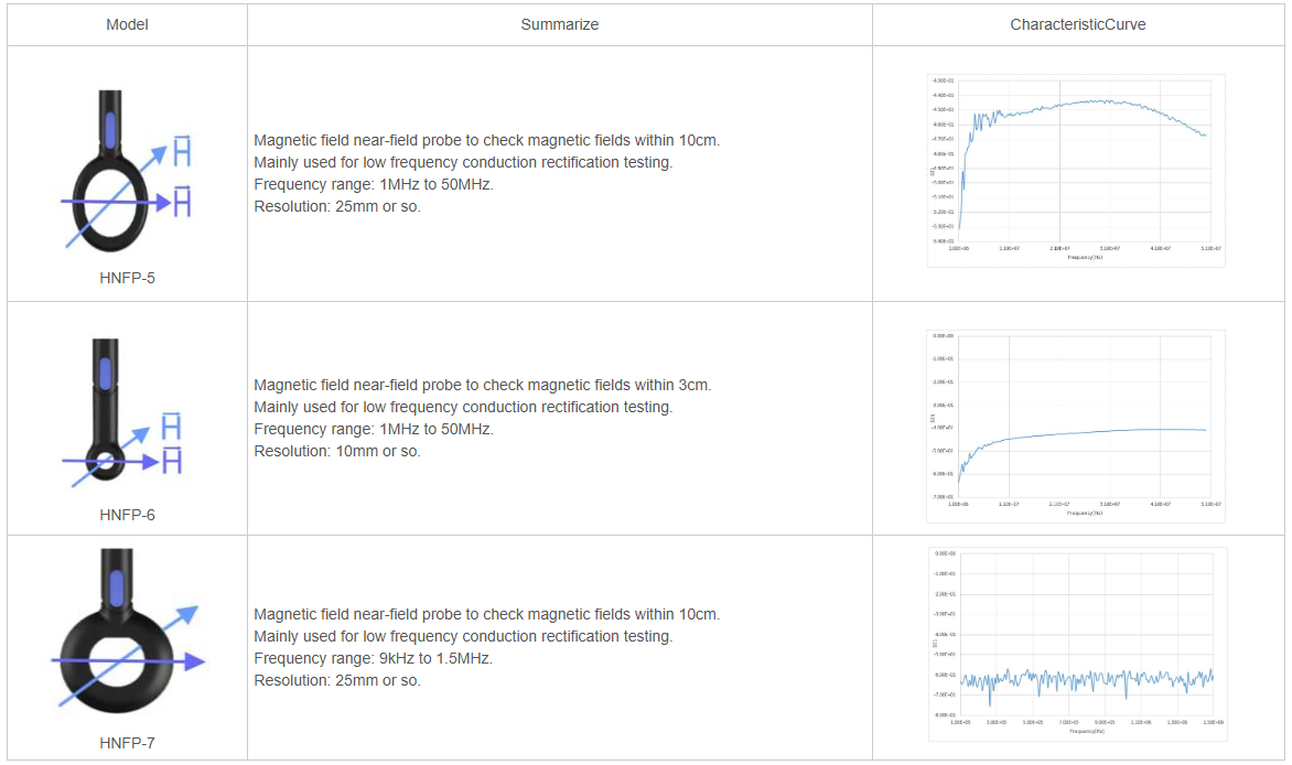 Zestaw sond serii HNFP obejmuje trzy niskoczęstotliwościowe sondy zaprojektowane do pomiaru pól magnetycznych (H). Są to sondy pola bliskiego, które przede wszystkim służą do lokalizowania źródeł zakłóceń magnetycznych. Sondy działają w zakresie częstotliwości od 9kHz do 50MHz i dostępne są w dwóch wariantach kształtu. Podłącza się je bezpośrednio do spektrometru lub oscyloskopu za pomocą kabla 50 Ω. Kiedy zakłócenia przewodzone lub emitowane przez urządzenie przekraczają dopuszczalne normy, sondy pola bliskiego pozwalają zidentyfikować, który element lub obwód generuje zakłócenia o określonej częstotliwości, wykryć kanały sprzężenia między modułami oraz określić częstotliwość przełączania sygnałów czy napięcie RF w systemie. W przypadku słabych sygnałów interferencyjnych sondę można podłączyć do przedwzmacniacza RF HNFPA-1 (o wzmocnieniu 30 dB), co zwiększa czułość pomiaru.