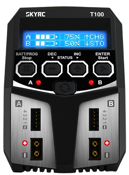 SkyRC T100 to kompaktowa, dwukanałowa ładowarka AC (zasilana z sieci 100V - 240V), idealna dla modelarzy i hobbystów. Dzięki dwóm niezależnym obwodom, oferuje 2 x 50W mocy ładowania, co pozwala na jednoczesne ładowanie dwóch różnych akumulatorów, nawet o odmiennej chemii i konfiguracji. Maksymalny prąd ładowania wynoszący 5A na kanał zapewnia efektywne i szybkie przygotowanie pakietów do pracy. Urządzenie jest w pełni uniwersalne, obsługując wszystkie najpopularniejsze typy ogniw: LiPo, LiFe, LiIon, LiHV, NiMH, NiCd oraz Pb (kwasowo-ołowiowe).