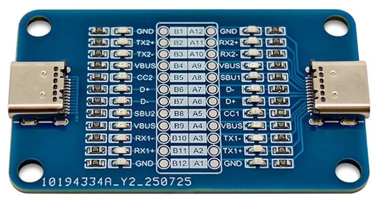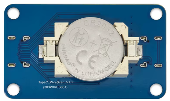 Otwartego modułu na wysokiej jakości niebieskim laminacie PCB o wymiarach 50 x 30 mm. Na płycie głównej zintegrowano dwa gniazda żeńskie USB-C oraz zestaw 24 diod LED, które odpowiadają poszczególnym pinom złącza (m.in. GND, VBUS, CC, D+, D-, TX, RX). Tester zasilany jest baterią CR2032 (brak w zestawie), której gniazdo umieszczono na rewersie płytki. Brak obudowy ułatwia dostęp do pól pomiarowych oraz inspekcję wizualną ścieżek.