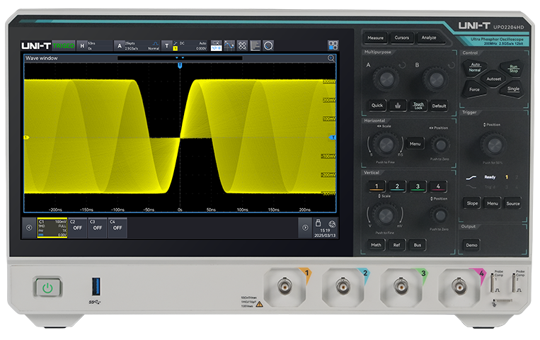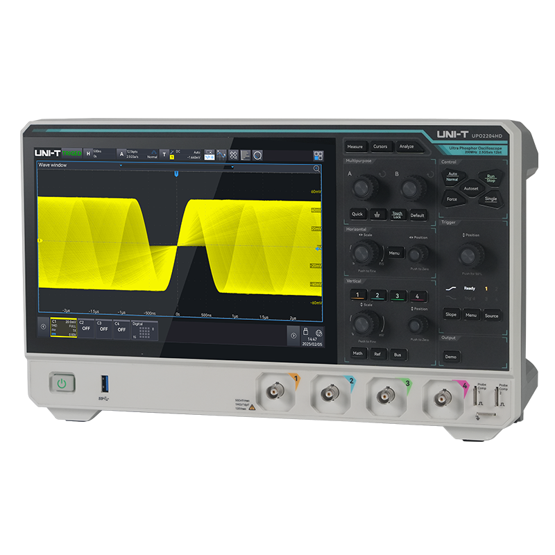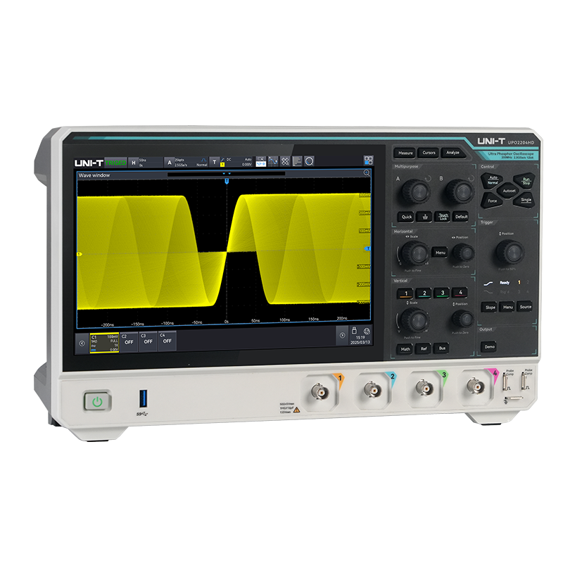 - model: UPO2204HD - pasmo analogowe: 200 MHz - próbkowanie w czasie rzeczywistym: do 2,5 GSa/s - rozdzielczość pionowa: 12 bitów (do 4096 poziomów kwantyzacji) - kanały analogowe: 4 - pamięć próbek: do 100 Mpts - szybkość akwizycji przebiegów: do 250 000 wfms/s (w trybie sekwencyjnym: do 1 000 000 wfms/s) - funkcje pomiarowe (6 w 1): oscyloskop wysokiej rozdzielczości, analizator widma, woltomierz cyfrowy, licznik częstotliwości, analizator protokołów, analiza mocy - pomiar parametrów: 56 typów, z obsługą histogramów i wykresów liniowych - rejestracja przebiegów w czasie rzeczywistym: do 125 000 ramek, możliwość eksportu na pamięć USB - funkcja FFT: rozszerzona FFT do 4 Mpts, funkcje analizatora widma (ustawianie częstotliwości, krzywa wodospadowa, tryby detekcji, markery) - programowa funkcja ERES (zwiększona rozdzielczość): do +4 bitów - funkcja anlizy mocy (opcja)
