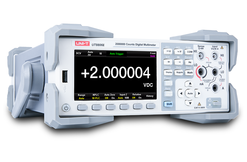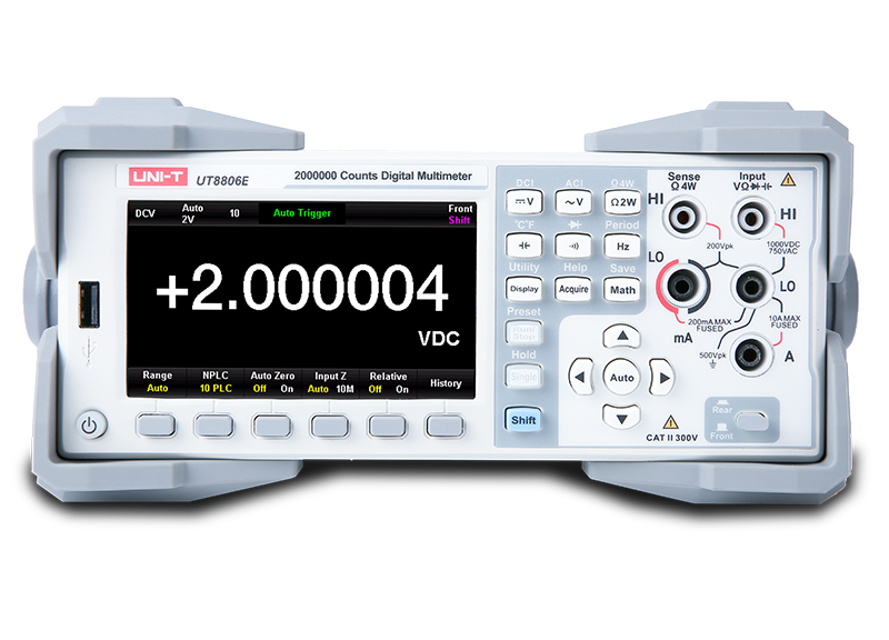 UT8806E został zaprojektowany z myślą o wygodzie i bezpieczeństwie użytkownika. Wyposażono go w pamięć NAND o pojemności 1 GB, umożliwiającą zapis do 10 000 wartości i historii pomiarów. Dzięki wbudowanemu systemowi kompensacji temperatury oraz funkcji pomocy, korzystanie z urządzenia jest intuicyjne nawet przy rozbudowanych pomiarach. Bezpieczeństwo zapewnia ochrona przed przepięciami do 1000 V, wbudowane bezpieczniki oraz akustyczny buzzer. Ogromną zaletą tego modelu jest również wszechstronność komunikacyjna – multimetr współpracuje z popularnym protokołem SCPI i pozwala na obsługę oraz zapis wyników przez interfejsy USB Device, USB Host, LAN, GPIB oraz RS-232C. Obsługuje standardy VXI11, USBTMC oraz U-disk, co ułatwia integrację z systemami automatyki pomiarowej oraz pracę w środowiskach badawczo-rozwojowych. Całość zamknięto w solidnej obudowie o wymiarach 378 × 225 × 113 mm i wadze 3,39 kg, z zasilaniem sieciowym 220–240 V. UT8806E to precyzyjne i niezawodne narzędzie, które sprawdzi się zarówno w codziennej pracy laboratoryjnej, jak i w zaawansowanych aplikacjach przemysłowych, gwarantując użytkownikowi pewność i dokładność pomiarów na najwyższym poziomie.