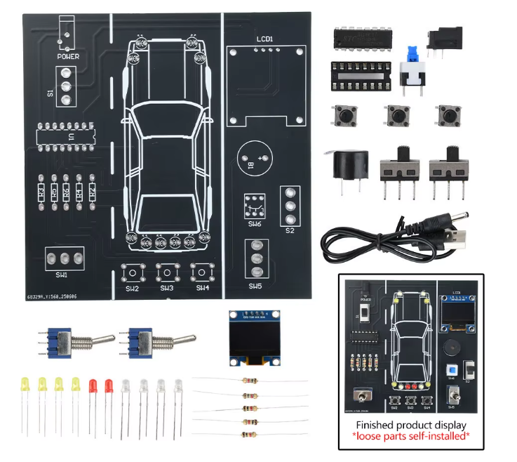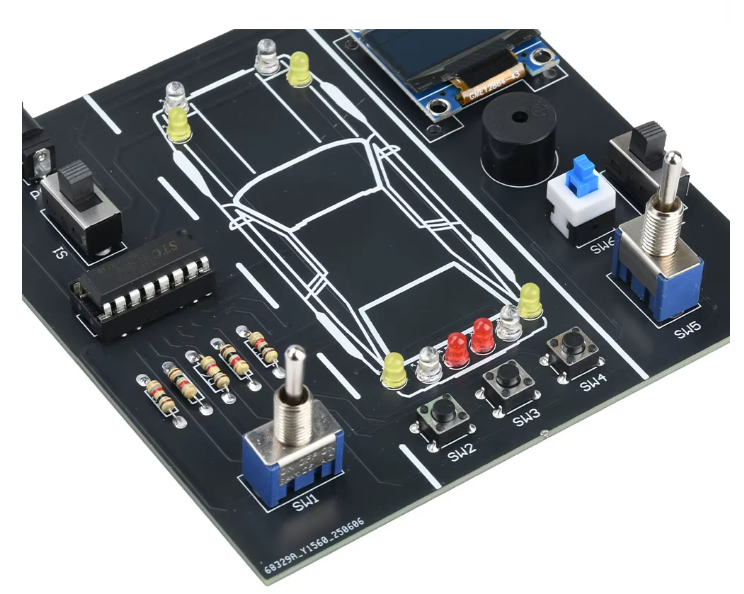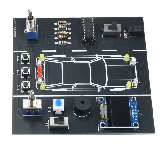 Zestaw edukacyjny DIY Car Driving Simulator to zaawansowany projekt, stworzony z myślą o pasjonatach elektroniki pragnących doskonalić swoje umiejętności lutowania. Urządzenie po zmontowaniu pełni funkcję w pełni interaktywnego symulatora jazdy samochodem, odwzorowującego realne działanie oświetlenia i sterowania pojazdem. Sercem układu jest mikrokontroler sterujący logiką działania, który obsługuje sygnały wejściowe z przycisków i przełączników, wizualizując je na wbudowanym wyświetlaczu oraz poprzez system diod LED.
