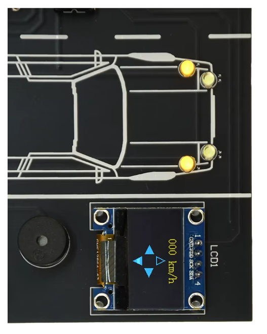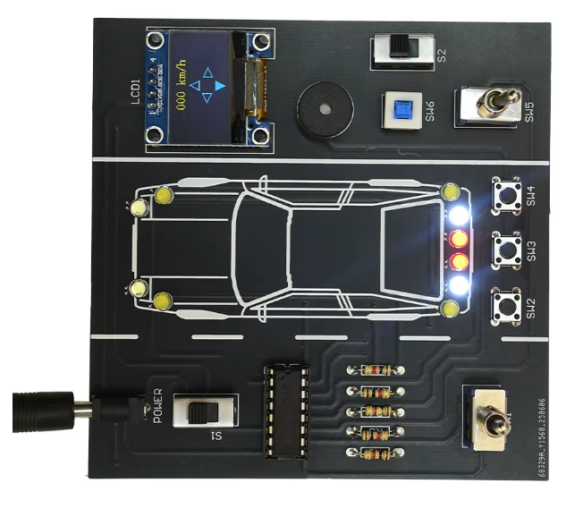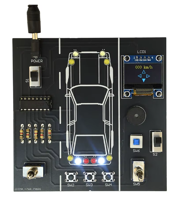 Produkt bazuje na wysokiej jakości płytce drukowanej (PCB) o wymiarach 100 x 100 mm z czytelnym opisem ułatwiającym montaż elementów przewlekanych (THT). Symulator wyposażony jest w cyfrowy wyświetlacz LCD, który pełni rolę prędkościomierza (wskazania do 180 km/h) oraz wskaźnika kierunku jazdy. Układ realistycznie symuluje pełne oświetlenie samochodowe: niezależne kierunkowskazy (lewy/prawy), światła awaryjne, światła mijania, światła STOP reagujące na hamulec oraz światła cofania. Dodatkowym atutem jest wbudowany buzzer, emulujący dźwięk klaksonu, co zwiększa immersję podczas użytkowania.